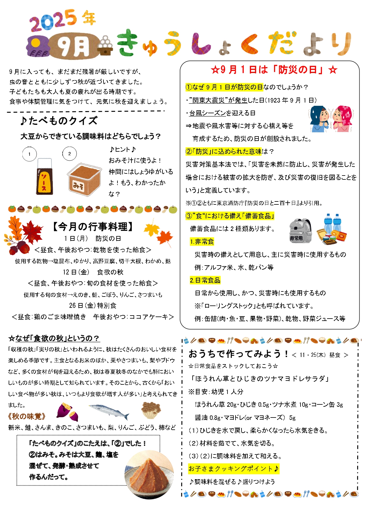 日中はまだ暑さが残りますが、朝晩は涼しくなり秋の気配を感じます。0歳児さんは、気になるものを見つけると一生懸命に近づこうとする姿がとても可愛らしいです。1歳児さんはまた、言葉もぐんと増え、お友だちの名前を呼んだり気持ちを伝えようとしたりする姿も見られるようになってきました。2歳児さんは、衣服の着脱や靴の脱ぎ履きなど、自分でやってみようとする気持ちも育っています。できるようになったことはたくさん褒め、自信につなげていきたいと思います。