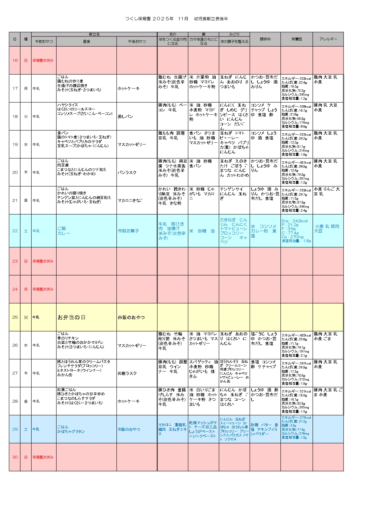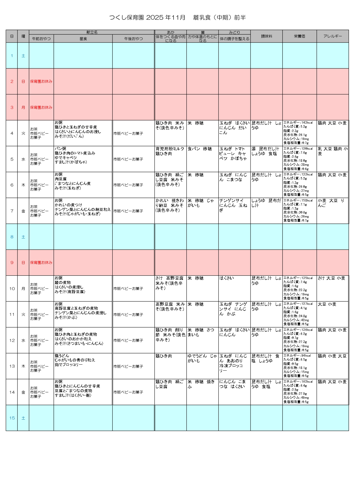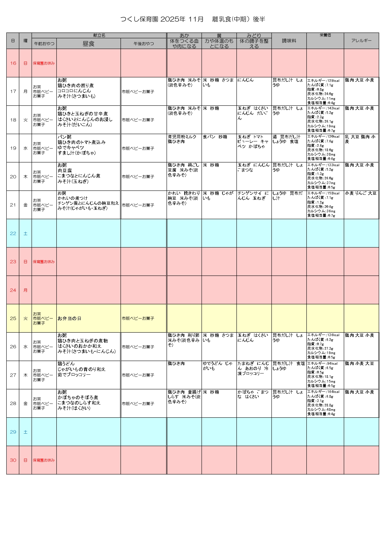 ※離乳食おやつはハインハイン等、個別対応になります。