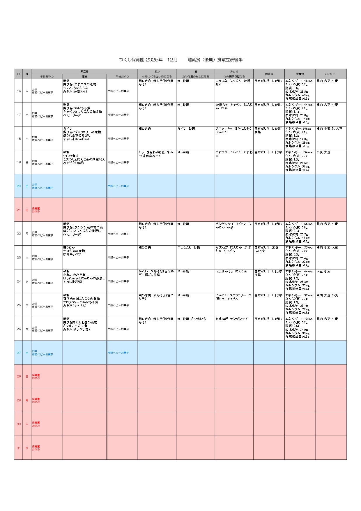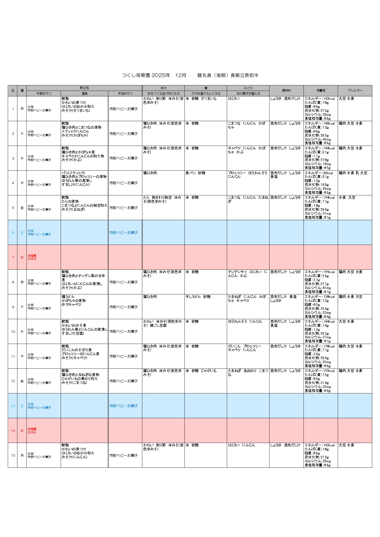 ※離乳食おやつはハインハイン等、個別対応になります。