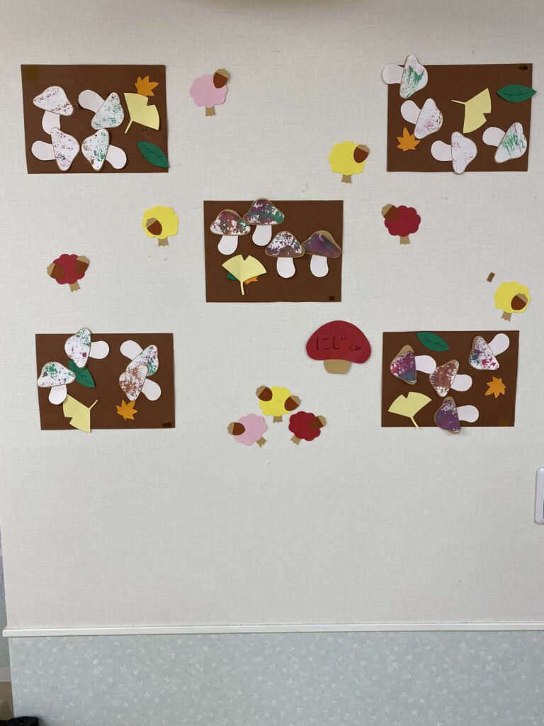 秋らしい9月の子どもたちの製作が保育室の壁を素敵にしてくれています😆
