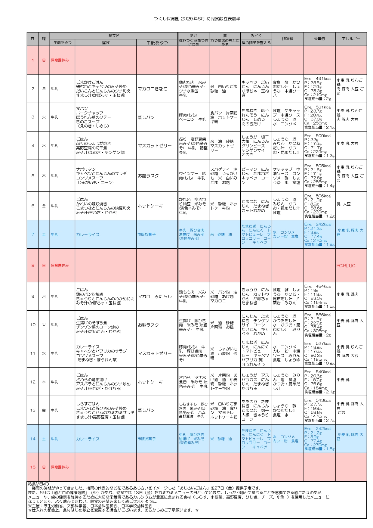 6月は歯の習慣があります。最近は、食べ物をよく噛んで食べる姿が増えてきました。「カミカミごっこしようね」と声をかけながら、一口ひとくちをゆっくり味わうことを大切にしています。
